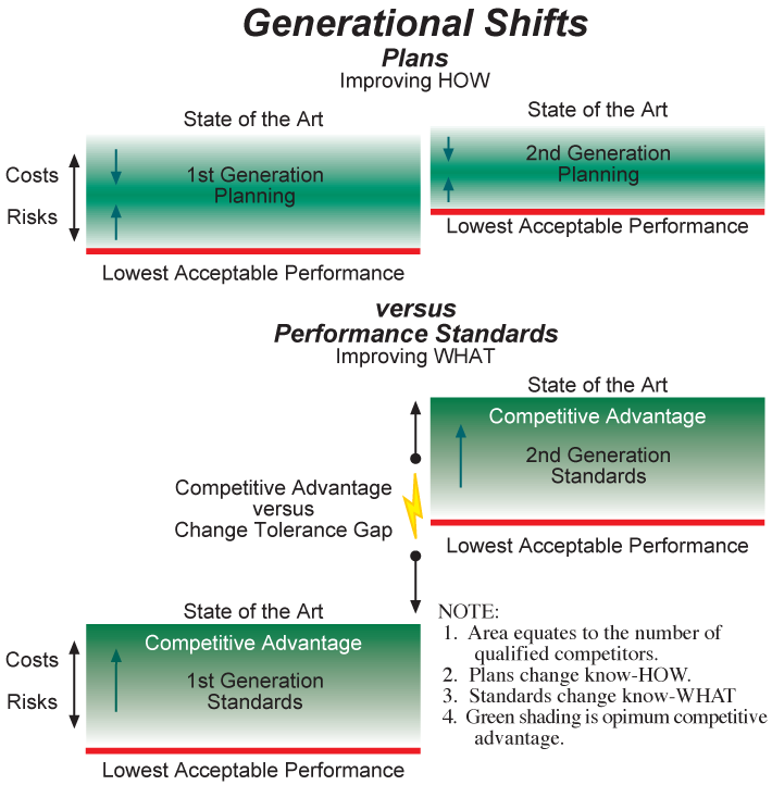 This graphic is intended to indicate the difference between Planning and a framework of Standards. Planning seeks consistency in HOW to do things. Standards incrementally push the state of the art in WHAT to do.