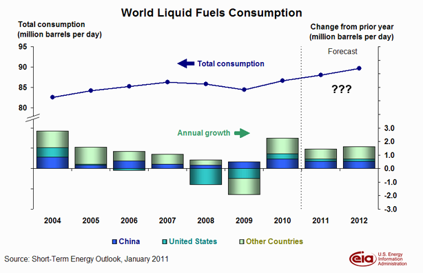 One of the biggest problem in understanding how the peak oil situation will play out is how oil scarcity will affect macroeconomic conditions. For instance crude production is at 2005ish levels at the beginning of 2011. Gas prices are around $3/gal and were lower in 2010. How was this accomplished? Mostly by making a significant number of people in industrialized nations unemployed. The US has 9+% unemployment. Globally we don't have enough oil for everyone to be employed. We may never see $10-20/gal prices, at least not in 2011 dollars. The high prices could push down employment which pushes down price. Most of the transition/substitution are based on high oil prices. A back of the envelope calculation for the Nissan Leaf puts the break even point at $8-10/gal. Can we sustain BAU at $10+/gal long enough to get enough people into Leafs.