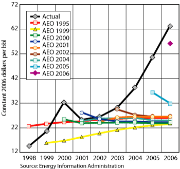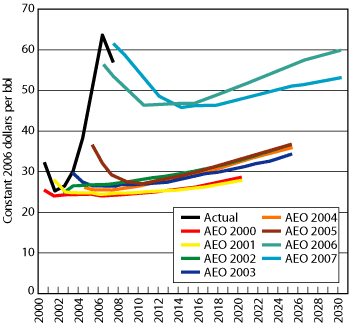 I have no particular problem with EIA, CERA, et al, being wrong. Very few predictions of oil price and production are consistently right. However, EIA is consistently wrong in the same direction with no acknowledgement of the error. Do CERA, EIA, et al, discuss the reasons for their errors? What irks me is when someone who is consistently wrong on price continues to make errant price predictions and then says that predictions of peak have been wrong in the past so they are wrong now.