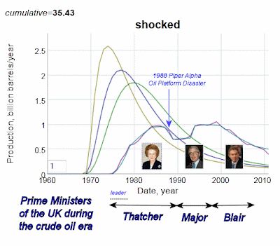 Figure 3: PM Margaret Thatcher was at the right place at the right time. Leader of the conservative party starting in 1975, and then became Prime Minister in 1979, she reigned during the huge buildup in oil production, which was temporarily halted by the Piper Alpha explosion in 1988.