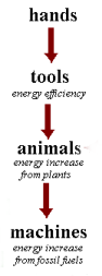 Throughout history, humanity progressed from using only their hands, to using tools, to using animals, and finally to using machines. Progressing from the work of hands to those of tools did not involve an increase in use of energy, but an improvement in the efficiency of energy use - a crowbar can let you lift a rock more easily than you can with your bare hands. But adding animals did not let us use energy more efficiently, it simply took energy from somewhere else and put it to work for us - the same applies with machines.