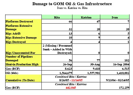 Even if platforms and pipelines are either unaffected or readily restored to service, the gas may not be able to flow to market without treatment. However, bypassing inoperable plants and redirecting flow to operational plants has mitigated the impact of the shut-ins. In 2003 (the latest year with complete data), almost three-fourths of total U.S. marketed gas production was processed prior to delivery to market.At present the US has 3,229 Bcf/d (3.229 Tcf) in storage (4% above the 5 year average). The EIA expects that natural gas production will be around 19.1 Tcf in 2005. Demand was originally expected to increase by 3.7% this year, but, due to the high prices is now expected to drop about 0.8%, over the 22 Tcf consumed in 2004, which included about 4.1 Tcf of imports, about 0.65 Tcf of which is LNG. Note that while this averages 60 Bcf/day demand is quite seasonal. This leads to stock draw downs being required in January and February. In 2003 these were 841 Bcf and 676 Bcf respectively leaving, by the end of March, only 730 Bcf in working storage. Industrial demand is however dropping due to the high prices, by about 8%, while residential demand can also be expected to decline.A number of processing plants in Louisiana and Texas, with capacities equal to or greater than 100 million cubic feet per day, are not active. These plants have an aggregate capacity of 6.45 billion cubic feet per day (Bcf/d), and they had a total pre-hurricane flow volume of 3.81 Bcf/d.