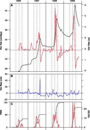 Figure 3. (A) Horizontal ice velocity (red curve) along a smoothed line of motion showing ice accelerations during the summer melt seasons and the abrupt transitions to deceleration around the times of melt cessation. The cumulative additional motion (horizontal residual, black) relative to a wintertime-average velocity of 31.33 cm/day is 6.0 m by the time of the maximum velocity in 1999. (B) The vertical residual (blue) indicates a 50-cm uplift at the time of the 1997 transition from accelerating flow to decelerating flow. (C) Cumulative PDDs and PDDs for 10-day intervals (10d DD, red) from temperatures measured at the Swiss Camp, showing correlations of the melting with the intensity and timing of the ice accelerations and decelerations (units are degree-days). Vertical dotted lines mark May 1, July 1, and September 1 for each year. |