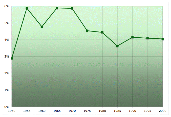 Left panel. Year-on-year percentage change in global oil production 1965-2004. Source: BP Statistical Review of World Energy. Click to enlarge. Right panel - world annual GDP growth 1950-2000 averaged over five year intervals. Source: Brad deLong. Click to enlarge.